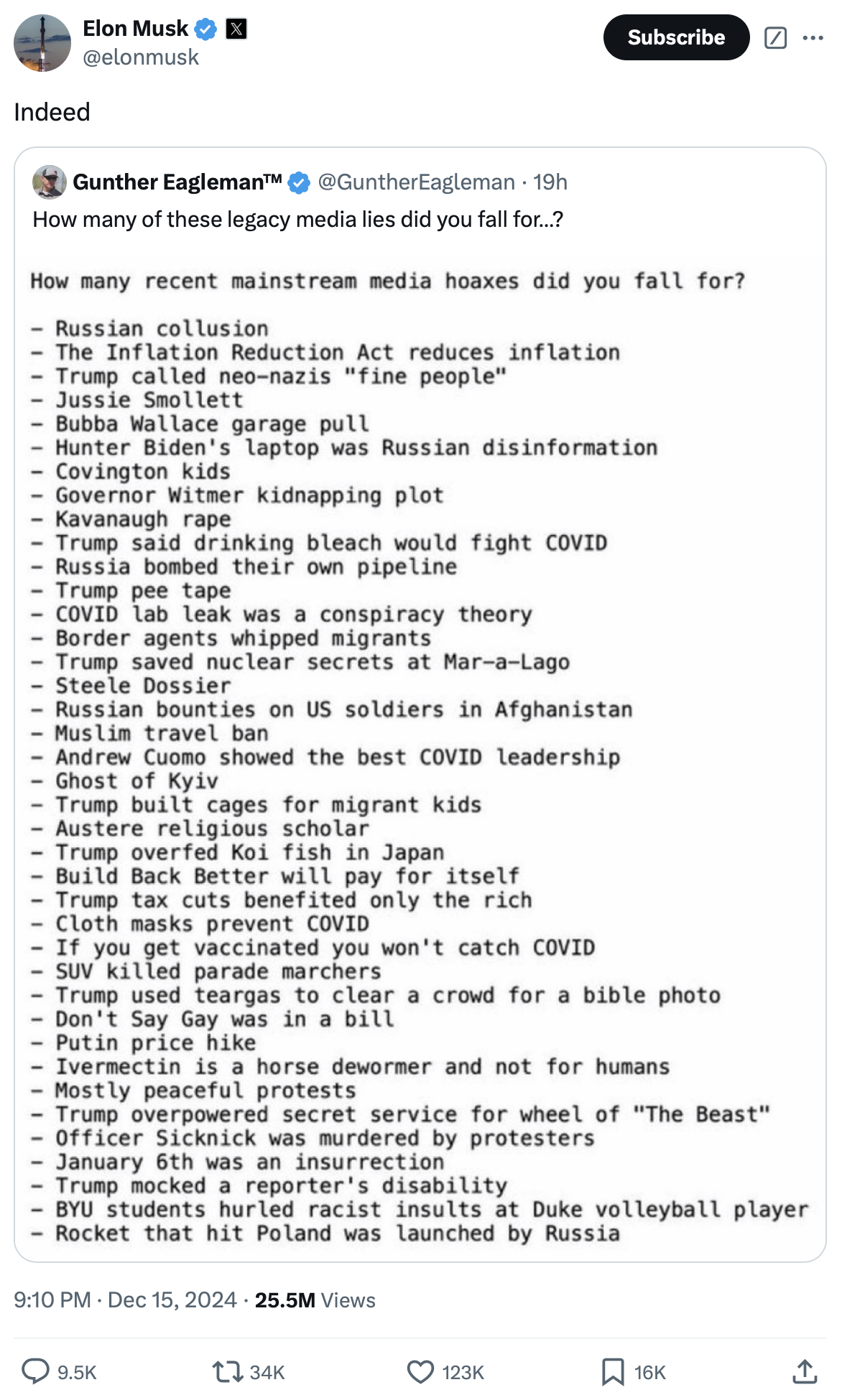 Elon Musk, a billionaire oligarch who purchased Twitter in order to manipluate public discourse, criticizes the owners of other media because those owners are oligarchs who also manipulate information.